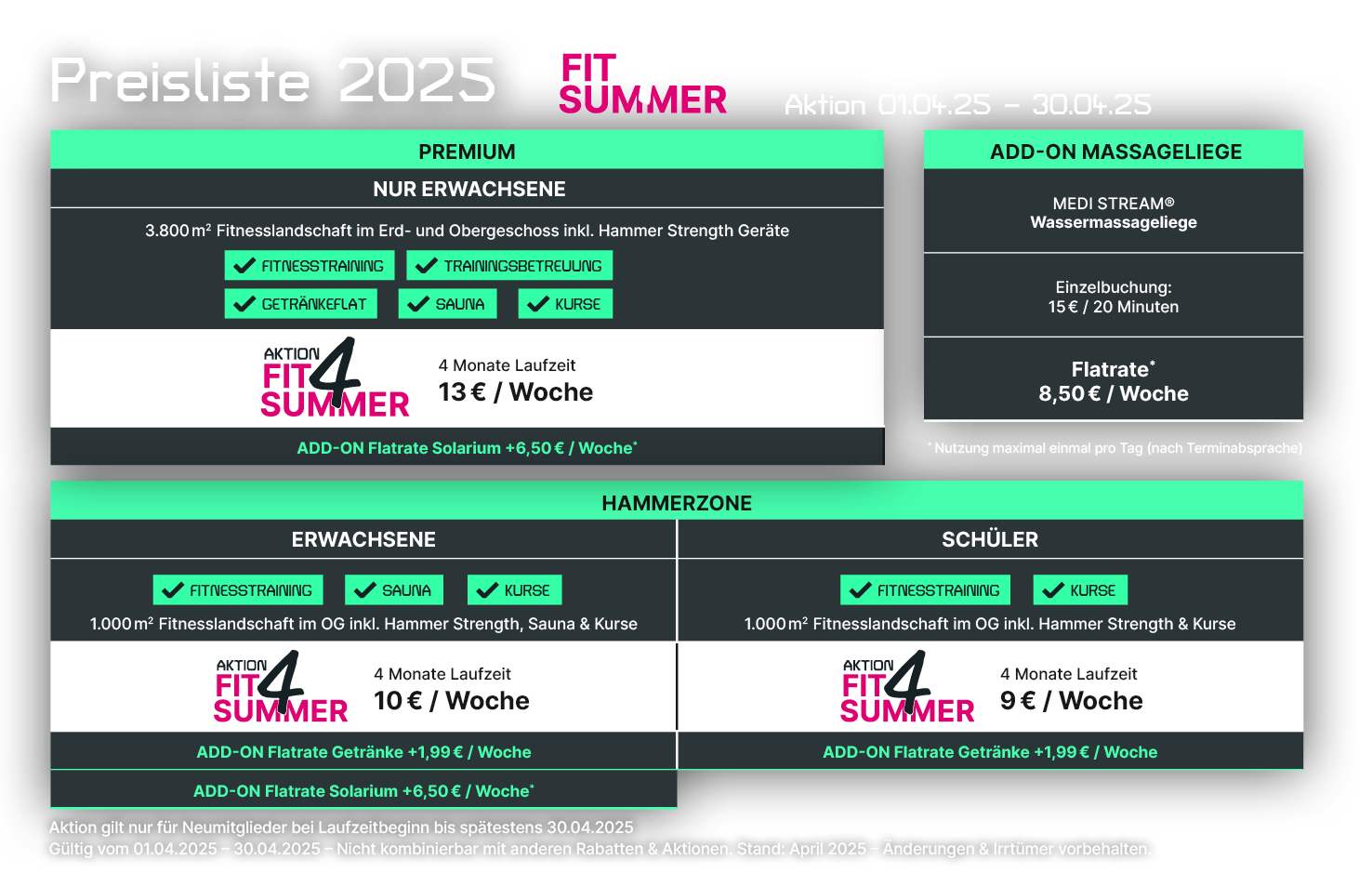 Der Sommer kommt – und mit ihm Deine Gelegenheit, fit zu werden! Mit unserer Fit4Summer-Aktion trainierst Du 4 Monate lang zu einem Top-Preis ab nur 9 € pro Woche.* Perfekt für alle, die ihre Fitness auf das nächste Level bringen und sich rechtzeitig für die warme Jahreszeit in Bestform bringen wollen!