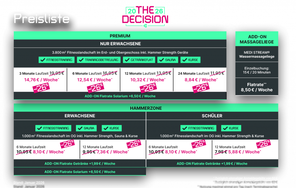 Du entscheidest Dich dafür, mit Fitness zu starten – und Du entscheidest selbst, welcher Tarif und welche Laufzeit zu Deinem Leben passen. Flexibel, transparent und ohne Umwege.